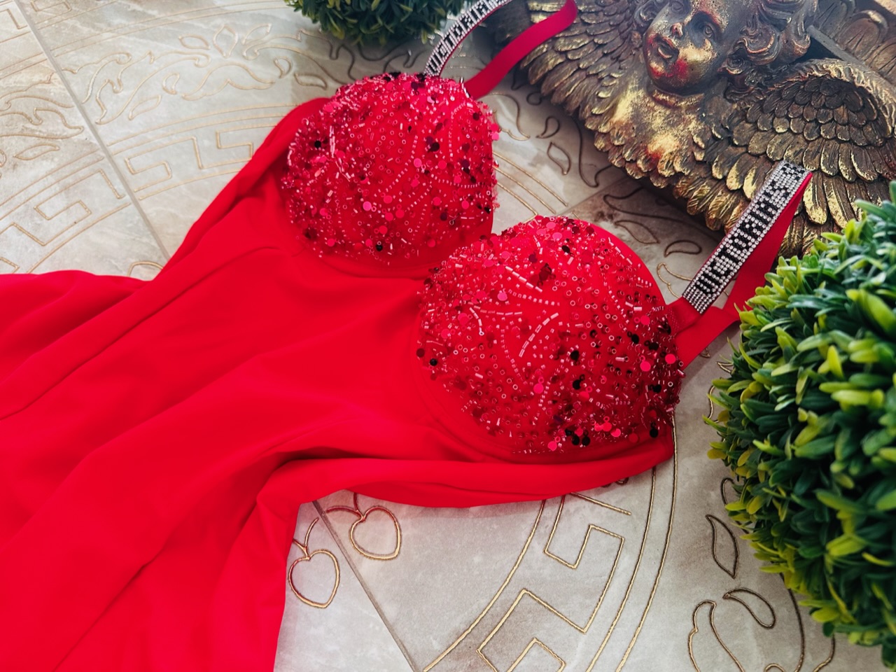 Išskirtinio dizaino siuvinėto kaušelio bikinis su žėrinčiomis šleikutėmis.
